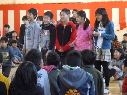 くす玉わりに続き、全校で「君をのせて」を合唱しました。