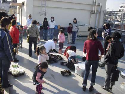 手入れ作業の後は、いつものように、シシトウ、ナス、ピーマン、ブロッコリーなどの種をポットにまいたものを持ち帰っていただきました。