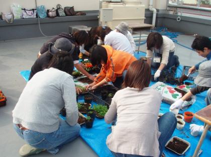 屋上では、発芽した苗を小さなポットに移し替えました。今回も家庭に持ち帰って育て、大きくなったところで花壇に植え替えをする予定です。