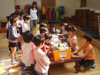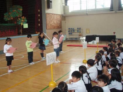 学校探険をした後、体育館で遊んで帰りました。今日のホスト役は1年生です。生活科の学習で作った、ゲームなどでお店やさんを開きました。なかに、拾ってきたドングリなどの秋の実を使ったものもありました。