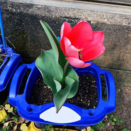 18日にわたしたはちに、チューリップのきゅうこんをのせておきました。同じきゅうこんから、まい年さかせるのはむずかしいのですが、うまくいくと来年もさかせることができるかもしれません♪
