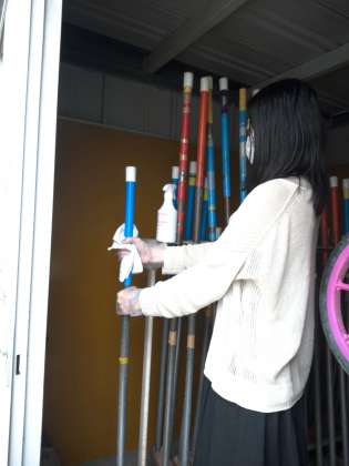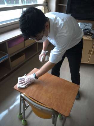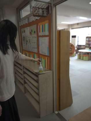 学校再開後の感染予防対策の一つとして、学校の設備を消毒したり、手指用の消毒薬を設置したりしています。