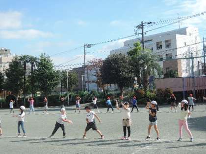 2年生の表現運動では、青空の下、楽しみながら体を思いっきり動かしました。