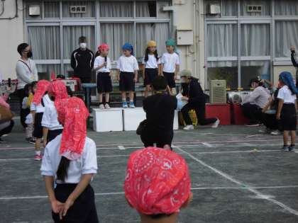 1年生は「かけっこ」と「ひょっこりひょうたん島のダンス」を、2年生は「かけっこ」「パプリカのダンス」そして「全員リレー」を行いました。