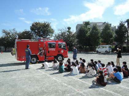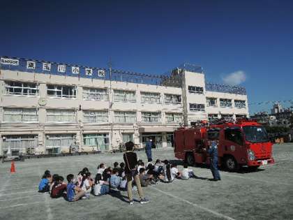 26日(月)3年生は消防署の方々に出前授業をしていただきました。本来ならば消防署にお伺いし、署内でのお仕事の様子や消防署の仕組み等を教えていただくところでした。署内での密を避けるために来校いただき、校庭にて署員の方々からお仕事やポンプ車の説明等をお話ししていただきました。皆、真剣に聞く姿がとても立派でした。