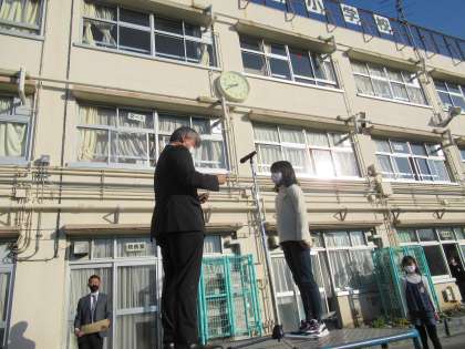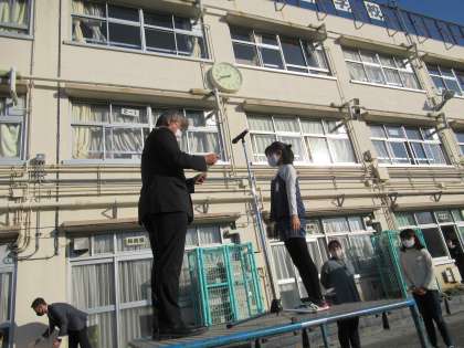 12月7日(月)の全校朝会で、交通安全ポスターと税の絵葉書の表彰をしました。