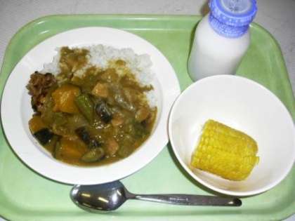 今日のメニューは『夏野菜カレーライス、福神漬け、牛乳、蒸しトウモロコシ』。
