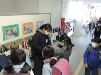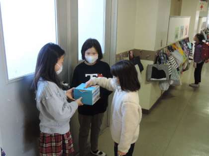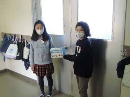 世界の子どもたちの命と未来を守る活動のために、登校した児童は教室前にいる代表委員会の担当児童の持つ箱に、気持ちを込めて入れていました。