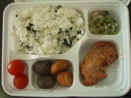 今日のメニュー わかめごはん 鳥の照り焼き 煮物 ミニトマト 野菜のゆかりあえ