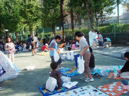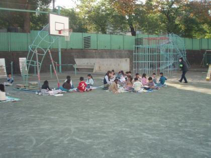 今日の給食はお弁当給食です。校庭や屋上で青空の下、楽しく給食を食べました。