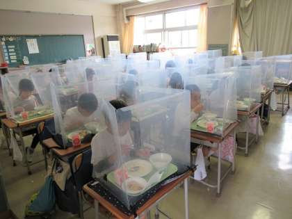 新年度が始まって、給食もスタートしました。昨年度と同じように、子どもたちは、手洗いや自分の机にパーティションをおくことをきちんとして、給食をいただいています。