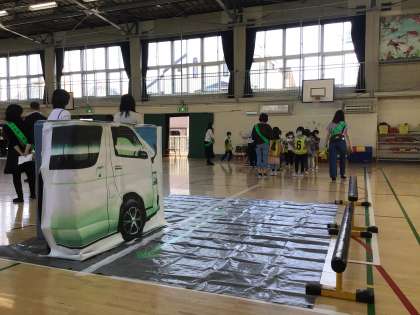 玉川警察署の職員の方とPTAの役員の方にご協力いただき、横断歩道の渡り方や車が停まっているときの注意などについて、体験を交えながら学ぶことができました。