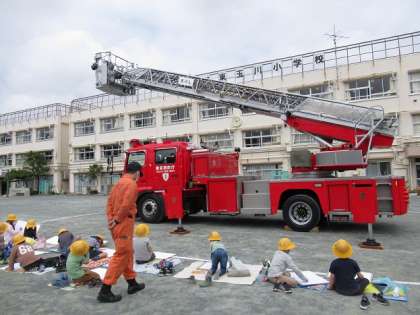 好天の下、1年生は、大きなはしご車とポンプ車を間近に見て興奮気味でした。それでも、きちんとごあいさつ、お話を聞いて熱心に絵をかくことができました。