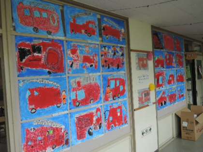 ポンプ車、はしご車、消防士さん、画用紙いっぱいに、それぞれの児童が工夫し表現した絵でいっぱいです。