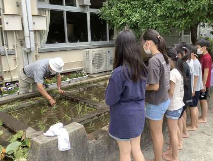 5年生は、社会科の学習で米作りについて学びます。その学習の一環として、5年生は5月31日(月)2・3校時に、学校にある小さな田んぼで田植え体験をしました。講師の先生に苗の植え方を教えていただき、多くの子が裸足になって田んぼに入りました。友達の楽しそうな姿を見て、「やっぱり田んぼに入ろう。」と挑戦した子もたくさんいました。「ずっと田んぼに入っていたい!楽しかった!」と、小さな田んぼでも田植えを大いに満喫した子ども達。今から秋の稲刈りを楽しみにしています。ご来校の際は、ぜひ稲の成長もご覧ください。