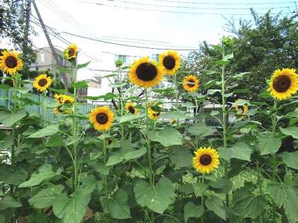 3年生の教材園に大きなヒマワリが咲いています。夏の光を受けて、ぐんぐん成長し、大人の背丈よりも高くなっているものもあります。みんなでおしゃべりしているようで、楽しそうです。
