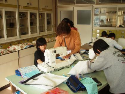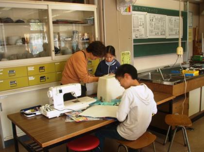 5年生は家庭科でナップザックを作っています。ミシンを使っての作業をしています。5・6年生のミシンの学習には、地域の皆さんが学習支援としてボランティアにきてくださっています。