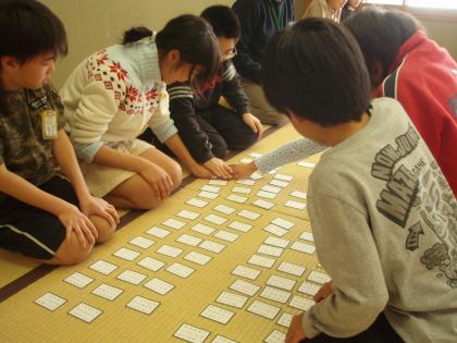 今年から始まった、教科「日本語」の学習で、百人一首を学習しました。教科書を何度も読んだり、本物の百人一首の札を使って覚えたりしました。今日は、和室で3人でグループをつくり対抗戦をしました。先生が読み手となり、目をさらのようにして取り札を探しました。ひらがなだけだったり、昔の読み方だったりして、一苦労。でもこれだけはという札をみんなもっていて、ここぞとばかりに取り合っていました。