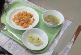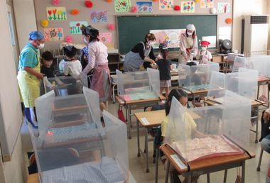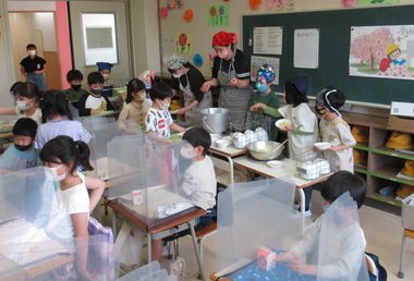 入学したばかりの1年生ですが、日々学校生活を学んでいます。給食も、先生と一緒に配膳したり静かに待っていたり、楽しい給食の時間になるよう協力しています。