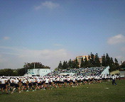 連合運動会がはじまりました。準備運動は本校の川村先生の指導です。