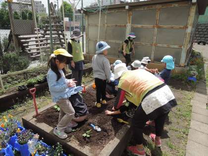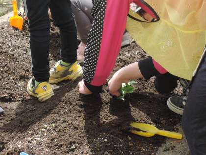 南奥沢保育園の皆さんがさつまいもの苗を植えにきてくれました。畑の貸し出しを始めて今年で3年目となります。本来ならば、畑の貸し出しで施設に慣れると共に、児童と園児の交流を行い、小学校へのスムーズな連携を図っていく予定でした。しかし、コロナ禍でここ2年は直接の交流が中止となっていました。withコロナの今、今年はできる限りの交流を行いたいと思っています。