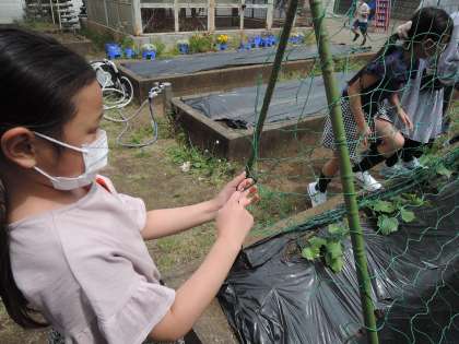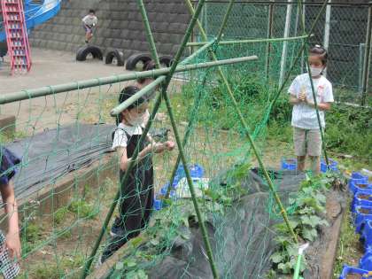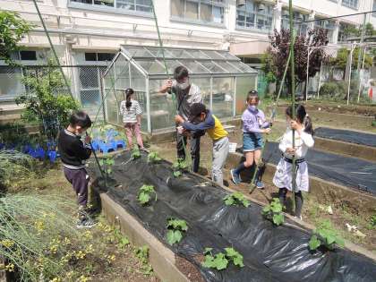 「畑に植えたキュウリにネットが必要だと思います。」2日の中休みに3年生の児童が話しかけてきました。「先生からも話してみるから、担任の先生にも話してごらん。」と返事をすると、さっそく昼休みには支柱をたて始めました。月曜日はそこで時間切れとなってしまったので、今日、続きを行っていました。中休みに先生と一緒にネットを張る子どもたち。「大きく大きく育ってほしい。」と成長を楽しみにしていました。