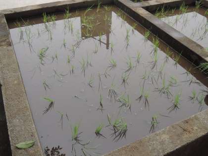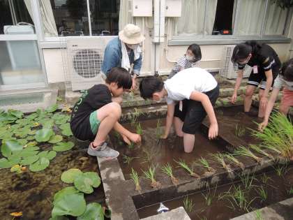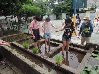 5年生はゲストティーチャーを招いて、田植えを行いました。靴を抜いで泥の中に入ると「うぁー」「きもちぃ〜」と子どもたち。足踏みをして底を整え、一つ一つ手作業で田植えを行いました。
