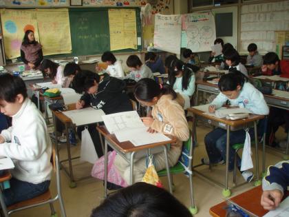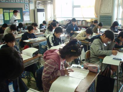 5年生は、都で一斉に行われた、「学力向上を図るための調査」を行いました。今年度から、問題解決にかんする調査と意識調査の2項目について実施しました。ふだんの教科のテストとちがって、今まで学習したことを生かして、考えをまとめて答えを解く、問題でした。どの子も、頭をフルに働かせて考えていました。