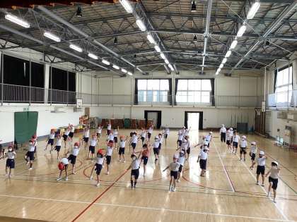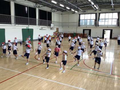 2年生がダンスの練習に励んでいます。リズムに乗って体全体で大きく表現するために、細かいポイントを確認しながら練習しているところです。運動会では、元気いっぱい表現できるように一人一人頑張っています。