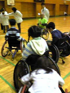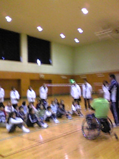 昼食後 車椅子バスケットボールを教えていただきました。本来、健常者が障害者スポーツを体験する場所ではないのですが、昼休みなら・・という特別のご配慮により体験させていただきました。