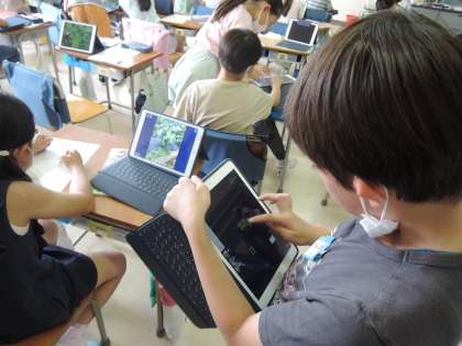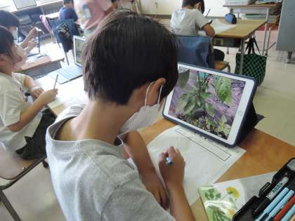 生活科の学習で、野菜を育てています。畑に行き、なすやキュウリ、オクラなどの観察をした後、写真を撮り教室に戻ります。撮った写真を見ながら、教室で記録をしています。撮った写真を拡大して細部まで細かく見ることができたり、落ち着いて記録をしたりできるタブレットの良さを活用して、2年生頑張っています。