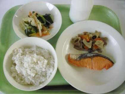 11月14日(月)の給食は「麦ごはん、鮭の塩焼き、れんこんのきんぴら、和風サラダ」でした。