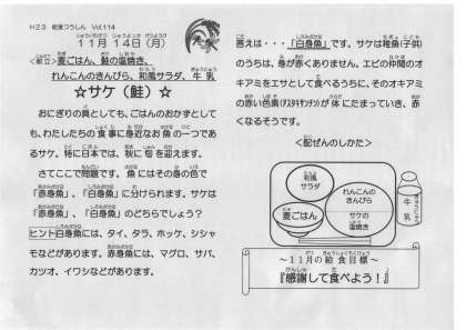 毎日、給食ワゴンにのせて学級に配布している「給食つうしん」の今日の題材には、鮭を取り上げてみました。