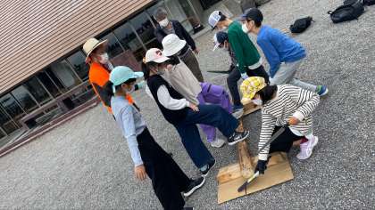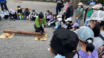 里山プログラムでは、丸太切り体験を行っています。山間の村では山林の手入れを行い、山のよい環境を整えています。実際に丸太を切ってみると、思っていたより難しいようで、「しっかり押さえて!」等、子どもたちの大変そうな声があちらこちらから聞こえてきました。