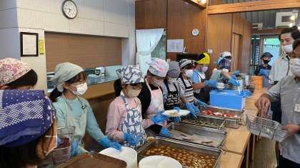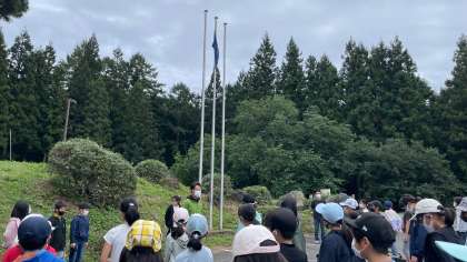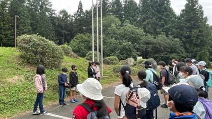 ご飯に焼き鮭、すまし汁の朝食後は閉室式でした。お世話になった「なかのビレッジ」ともこれでお別れです。この後は、村巡りと田園プラザでの昼食、そして学校へと向かいます。