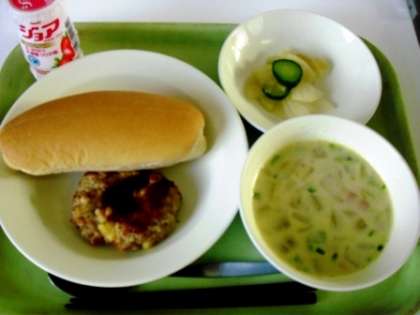 (左上の写真)18日(水)の給食は、アップルチーズハンバーグサンド、コーンポテトスープ、大根のレモンしょうゆかけ、ジョアでした。