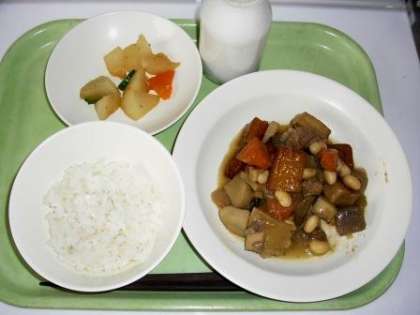 (右上写真)19日(木)の給食は、ごはん、豆入り筑前煮、野菜のピリ辛中華味、牛乳でした。