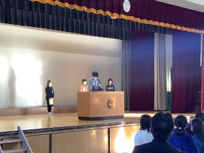 校長先生からは、子どもたちの2学期の頑張りについてお話ししていただきました。児童代表の4名も、2学期の努力をそれぞれ立派に発表することができました。ぜひ、ご家庭でもお子様と2学期に頑張ったことについて話題にされてみてください。