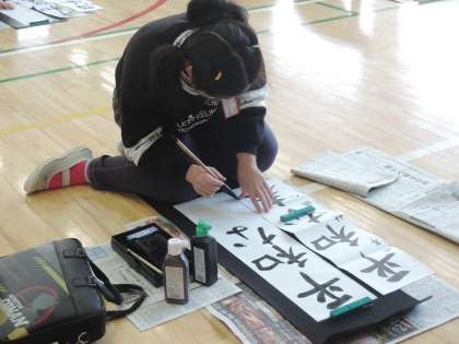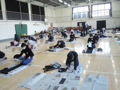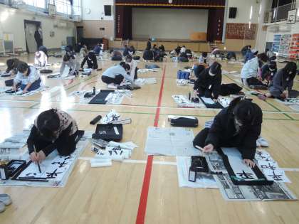 6年生は体育館で書き初め会を行いました。「文字がきれいに書けるようになること」や「今年の気持ちを表す」願いも込めて、集中して取り組むことができました。「平和な春」の言葉通り、今年は世界が少しでも平和にあってほしいですね。
