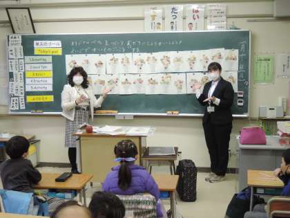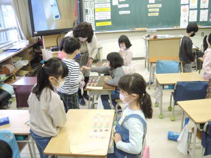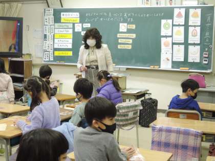 今日は英語教育推進アドバイザーのエミリー先生をお招きして、1年3組で外国語活動の授業を行いました。「えいごで かいものをする」というめあてをもって、友達とやりとりを行いました。Hello. Banana please. How many? Two please. Here you are. Thank you.習った英語をたくさん使うことができていました。完成したおいしそうなパフェを見ながら子どもたちは皆、「とっても楽しかった」「また来てほしい」と感想を話していました。来週は発表も予定しています。