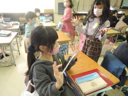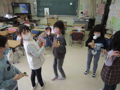 最近の休み時間、昔遊びをする一年生の姿が見られるようになってきました。雨の日の室内遊びをきっかけに始まったようです。これから生活科の学習でも昔遊びをすると、もっともっと流行りだすのではないかと思います。ご家庭でも、お子様とご一緒に遊んでみてください。