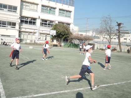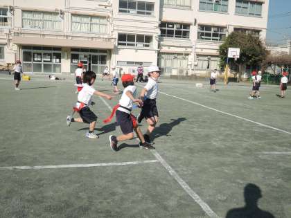 2年生の校庭体育では「たから運びオニ」を行っていました。腰につけたタグを相手にとられないようにし、宝(紅玉)を相手ゴールまで運ぶゲームです。タグを取られないように、スペースを見付けて走ったり、相手をかわす動きをしたりと、自分の体をコントロールして、全力で楽しむ姿が見られました。