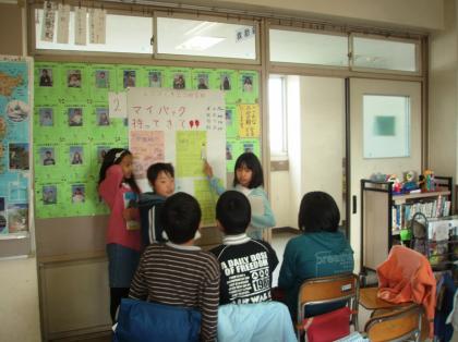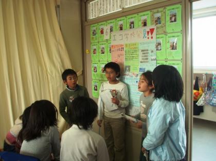 エコライフ研究所は、4年生の総合的な学習の時間の中でも、環境学習にかかわるもので、東玉川小学校の特色の一つです。2学期から、取材をしたり、自分たちで調べたりしてまとめました。今日は1組の友達や保護者、地域でエコ活動に携わっている方に聞いていただきました。