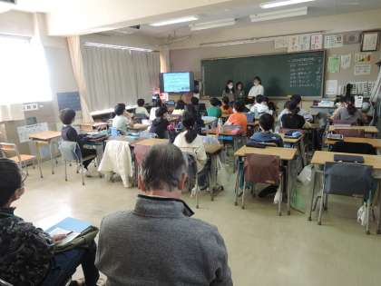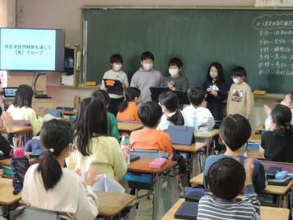 4年生は春夏秋冬の4回にわたり校外学習を行ってきた洗足池自然観察の発表会を行いました。観察に行った際お世話になった「城南環境学習支援」のゲストティーチャーの皆様をお招きしました。タブレットを使って自分たちでまとめた学習の成果を発表しました。写真やイラスト、見やすい文字の工夫がされ、大きな声での発表は、聞き手によく伝わったようでした。子どもたちの感想も、「他のグループの学習がよく分かった。」「カワセミを観れることは、とても珍しいことがよく分かった。」と関心が高かったことも分かりました。ゲストティーチャーの皆様も、立派な発表だったこと、タブレットが効果的に使えていることなど、たくさん褒めていただきました。充実した顔の4年生でした。
