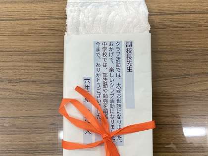 今日は、家庭科の時間に作成した雑巾のプレゼントを、6年生の児童が持ってきてくれました。「これを使って学校をきれいにしてください。ありがとうございました。」と嬉しい声もいただきました。卒業まで登校はあと6日。6年間通った学び舎を、まもなく6年生は巣立っていきます。