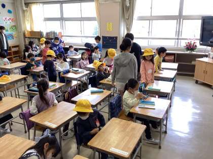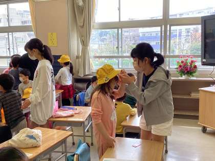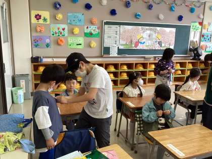 少々緊張した面持ちで、教室に入ってきた一年生。お迎えしたのは新6年生です。教室に入ったらランドセルの荷物を片付けて、名札を付けて、朝の準備を行います。6年生のお兄さん、お姉さんが優しく教えてくれています。