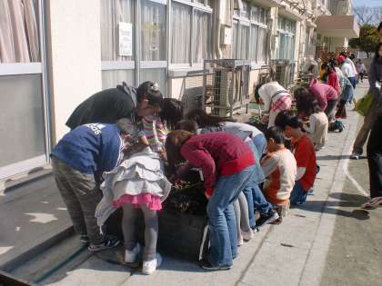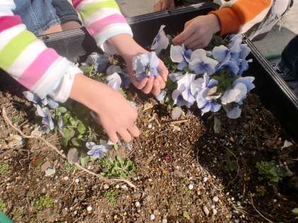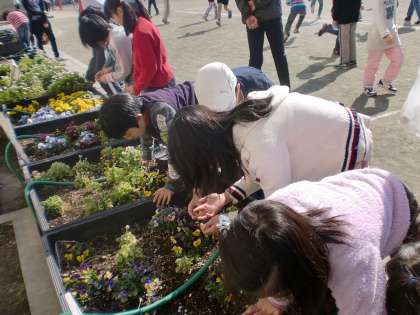 今日は中学年の担当日です。子どもたちは、花がらつみの仕方を先生から指導してもらった後、花壇の花がらを丁寧につんでいました。