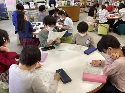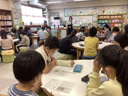 年度初めの図書の時間はオリエンテーションです。図書室の今年のお約束や注意事項をはじめ、本の貸出方法や並べ方などを確認しました。オリエンテーションの最後に、分類表を見ながら、どの分類にあたるのかのクイズも行いました。