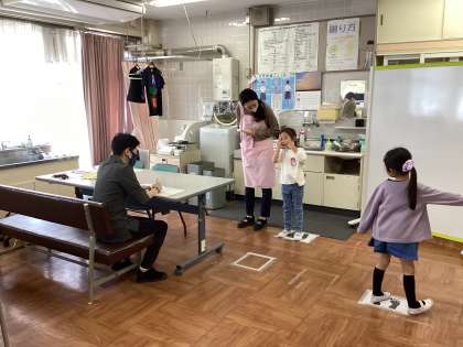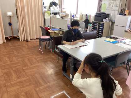 1年生は視力検査を行いました。保健室で行う視力検査に「ドキドキする」の声も聞こえましたが、説明をしっかりと聞き、穴の空いている方向を上手に指差しで示すことができていました。