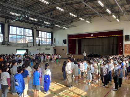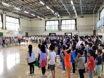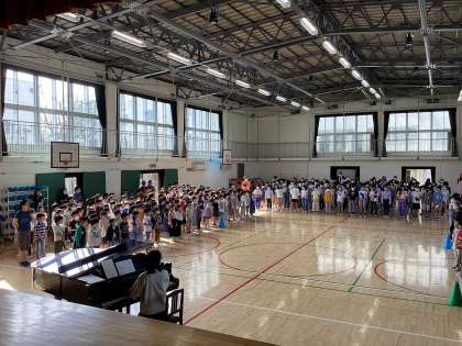 今朝の音楽朝会は体育館で行いました。2年生から6年生の歌のお手本を聴いてから、1年生みんなで校歌を歌いました。教室でも練習をしてきた成果を発揮し、とても上手に歌えた1年生は、お兄さんやお姉さんから拍手をもらって、とてもうれしそうな様子でした。その後は児童全員で校歌を歌って、気持ちのよい朝が過ごせました。
